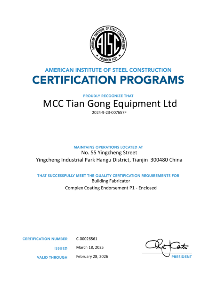 AISC認證是美國鋼結構協(xié)會針對鋼結構制造工廠的質(zhì)量管理體系認證,旨在確保企業(yè)具備符合北美市場要求的技術能力和管理規(guī)范。審核組先后審查了材料庫及廠區(qū)的各工位,并對材料管理、材料追溯、焊接工藝油漆工藝等生產(chǎn)過程控制進行了現(xiàn)場審核,其中對現(xiàn)場構件的追溯、油漆工理論及操作、焊工理論及操作、焊接預熱記錄、焊縫外觀及尺寸等進行了隨機的抽樣檢查,抽樣結果完全符合AISC程序文件和工藝要求。隨后,審核員對公司的質(zhì)量手冊、程序文件以及過程控制文件資料進行了認真審核。