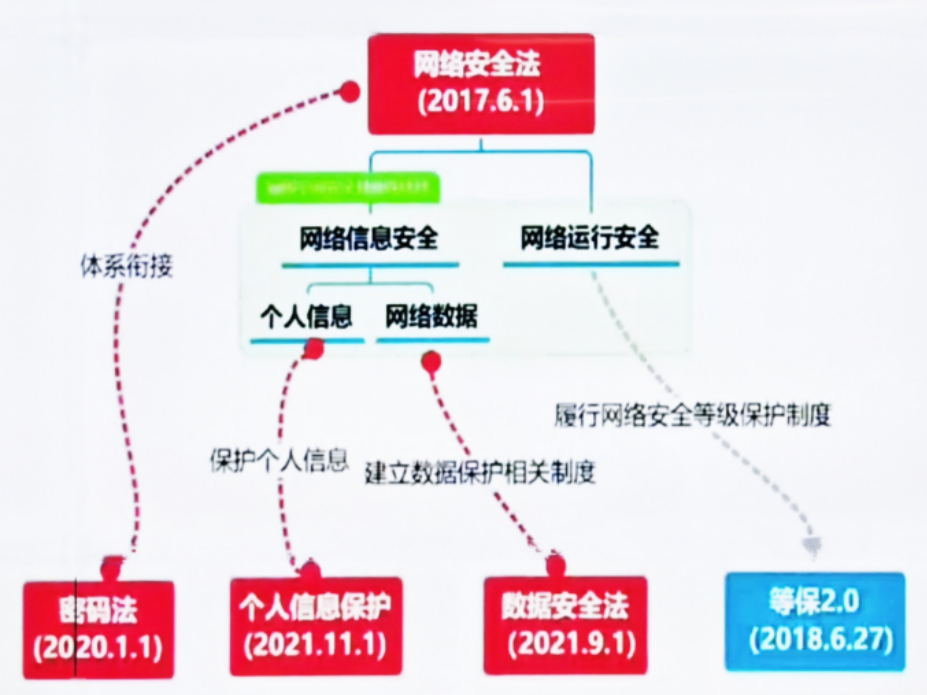 我國2017年6月1日起施行《網絡安全法》,這是我國第一部全面規范網絡空間安全管理方面問題的基礎性法律,主要涉及保護公民個人信息、嚴厲打擊網絡詐騙、以法律形式明確“網絡實名制”等重點事項;2021年9月1日起施行《數據安全法》,標志我國在數據安全領域有法可依,為各行業數據安全提供監管依據;2021年11月1日起施行《個人信息保護法》,嚴禁“大數據殺熟”、防止“過度采集”、保護個人敏感信息……