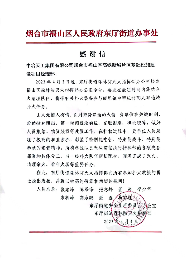 4月6日,渤海公司煙臺市福山區高鐵新城片區基礎設施建設項目部收到煙臺市福山區人民政府東廳街道送來的感謝信,對項目部聞令而動、迅速集結、趕赴現場,開展滅火救援行動表示感謝。
