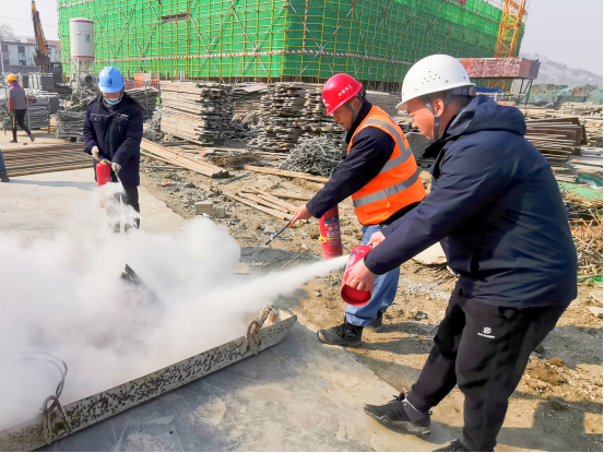 隨后,項目組織開展消防應急演練,演練場景設置為電焊工進行鋼筋焊接作業時,因大風天氣導致下落焊渣被刮到防水材料堆放處引發火災?,F場巡查人員發現火情后立即上報項目應急救援領導小組,領導小組第一時間啟動應急預案,各參演小組聞令而動、迅速集結,充分利用消防培訓中學到的技能,對火情進行正確判斷,在確保自身安全的前提下,采取有效措施進行緊急撲救,在火災初期及時撲滅明火。