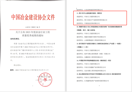 近日,中國(guó)冶金建設(shè)協(xié)會(huì)發(fā)布《關(guān)于公布2023年度冶金行業(yè)工程質(zhì)量?jī)?yōu)秀成果的通知》,渤海公司承建的周口市中心醫(yī)院新區(qū)醫(yī)院一期項(xiàng)目榮獲2023年度冶金行業(yè)工程質(zhì)量?jī)?yōu)秀成果獎(jiǎng)。