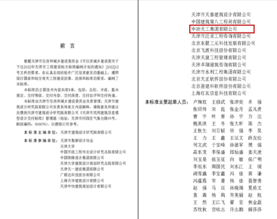 該項標(biāo)準(zhǔn)由天津市建筑設(shè)計研究院有限公司主編,參編單位包括天津市勘察設(shè)計協(xié)會、天津大學(xué)等單位,中冶天工作為參編單位之一,負(fù)責(zé)模型交付等相關(guān)內(nèi)容,編制工作主要由工程技術(shù)總院BIM研究院負(fù)責(zé)完成。在標(biāo)準(zhǔn)編制期間,BIM研究院嚴(yán)格按照市住房城鄉(xiāng)建設(shè)委關(guān)于天津市工程建設(shè)地方標(biāo)準(zhǔn)編制的通知和相關(guān)要求開展工作,與主編及各參編單位及時溝通、密切配合、緊密合作。編制人員充分結(jié)合中冶天工多個BIM項目實際應(yīng)用經(jīng)驗,對具體技術(shù)條文進(jìn)行反復(fù)討論與分析,定期參加天津市住建委組織的專題修訂會和標(biāo)準(zhǔn)評審會,對標(biāo)準(zhǔn)進(jìn)行認(rèn)真修改與校審,高標(biāo)準(zhǔn)完成各項編制工作。