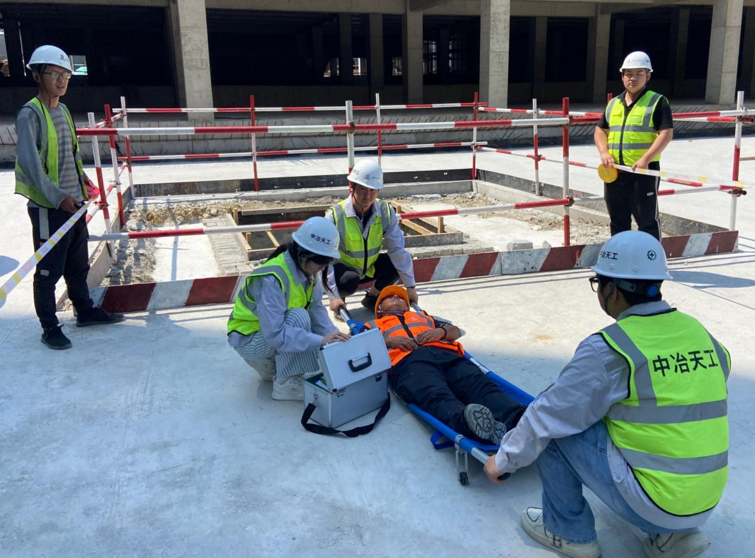 活動現場設立警戒組、救護組、搶險組、疏散組、聯絡組共5個應急救援小組,在演練前開展高處墜落和物體打擊應急救援演練前安全交底。本次演練模擬了工人在清理材料過程中,因高空墜落的鋼管砸中肩膀導致倒地受傷的情景。事故發生后,同班作業人員第一時間報告安全員,安全員立即報告項目負責人并撥打120,同時啟動應急救援預案,隨后警戒組第一時間疏散周邊人員并設立警戒區域,對傷員進行初步止血與救治,并安排人員在門口處引導救護車輛。整個演練過程緊張有序、反應迅速、配合默契,各環節銜接緊密,救援效率達到了預期效果,切實增強了全員安全意識和應急能力。