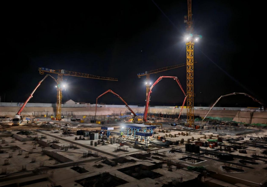 面對冬季低溫,團隊以“高標準、高效率、高安全”攻堅,300余名建設者多點同步推進鋼筋綁扎、混凝土澆筑,工序無縫銜接;管理人員駐守一線實時解決難題;安全交底100%覆蓋,堅守“無交底不作業”底線。塔吊24小時運轉,罐車穿梭,燈火通明的現場繪出“星夜攻堅、使命必達”的實干畫卷。